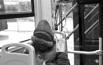 身穿红色棉袄,头戴两层帽子,郑州的一位八旬老太一大早就上了公交车。