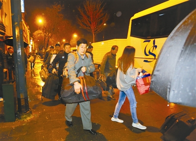 3月27日凌晨,在比利时首都布鲁塞尔,滞留的中国旅客冒雨离开下榻的酒店。