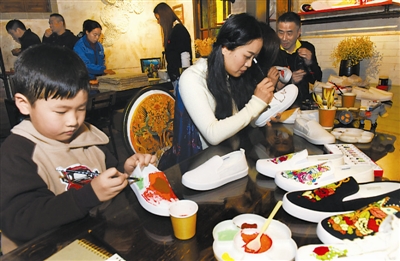 3月30日,5岁的北京小游客仁天佑(左一)等在沱川乡的线下体验店里绘制个性化布鞋。