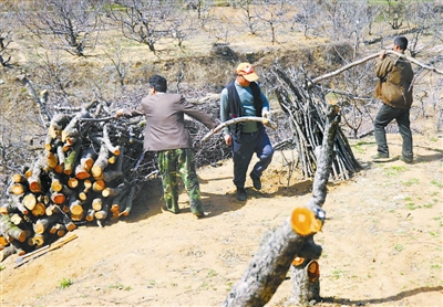 3月31日,在山东省烟台市福山区张格庄镇岔夼村,果农将砍伐的老残苹果树枝堆放在地头。