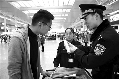 清明节运输期间,上海铁路警方督促安检人员对旅客及其行李物品进行“全覆盖”式严格检查,严防发生火灾爆炸等重大安全事故。图为虹桥站民警对携带违禁品进站的旅客进行宣传教育。 林荣贵 摄