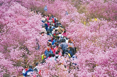 4月3日,游客在山东青岛大珠山上观赏盛开的野生杜鹃花。清明节期间,青岛大珠山万亩野生杜鹃进入盛花期,吸引众多游客到此踏青休闲。新华社发(张进刚 摄)