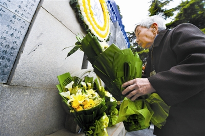 4月4日,南京大屠杀幸存者杨翠英在纪念馆遇难者名单墙前为当年遇难的亲人献花。