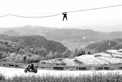 4月2日,浙江省宁海县桑州岭的高山里一名架线员像演杂技一样,在油菜花田上空架设电缆线。确保山区23个行政村,2.6万人早日全部享受到光纤服务。