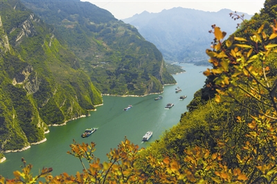 4月7日,船舶行驶在三峡库区湖北省秭归县兵书宝剑峡水域,库区水位下降后的消落带清晰可见。