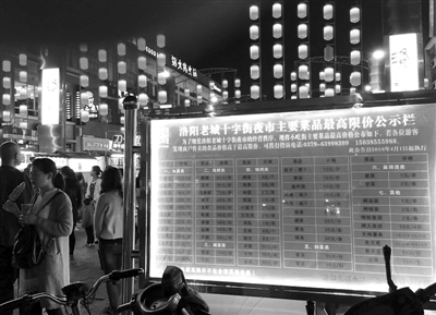 4月7日,在河南省洛阳市老城十字街夜市街口,摆放着名为“洛阳老城十字街夜市主要菜品最高限价公示栏”,包括水席、海鲜、烧烤、炒菜等在内7大类近60种小吃和菜品的名称与最高限价。若游客发现商户售卖的食品价格高于最高限价,可拨打投诉电话。
