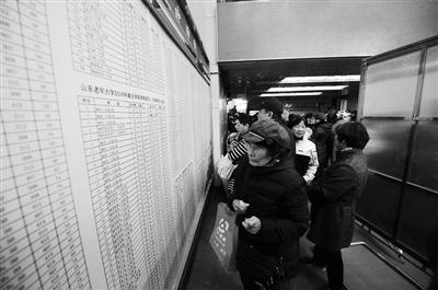 山东老年大学报名处 , 一位老人正在查看新学期录取名单 。