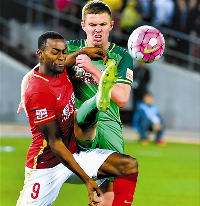 4月9日晚,在中超联赛第4轮比赛中,北京国安主场0比3负于广州恒大。恒大取得联赛三连胜,而国安依然一球未进。图为双方球员拼抢。