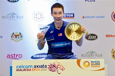 当日,在马来西亚吉隆坡举行的2016马来西亚羽毛球超级系列公开赛男子单打决赛中,马来西亚选手李宗伟以2比0战胜中国选手谌龙,夺得冠军。新华社发(张纹综 摄)