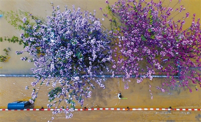4月11日,柳州市滨江西路延长线部分低洼地带进水,市民从洋紫荆树下走过。