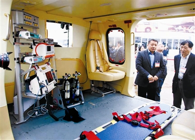 当日,上海瑞金医院、上海市医疗急救中心与上海金汇通用航空公司就“直升机救援合作”签约,共同推进申城空地一体化的救援网络建设。救援直升机又被称为“空中救护车”,配备医用担架、除颤监护仪、人工呼吸机、输液泵、吸痰机等医疗设备,在病人转运过程中随机医护人员可对病人病情实时监控并进行必要的救护。金汇通航新购买的25架直升机将于年内在全国范围内构建直升机救援服务网络。新华社记者 任珑 摄