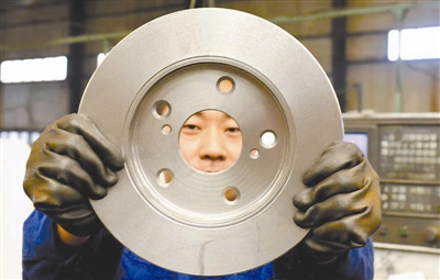 工人在生产车间检查汽车刹车片的产品质量。东方IC 供图