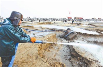 众所周知,在陆地上开挖路面已经不容易,更何况是在浩瀚无际的大海中。连云港港30万吨级航道工程是我国目前沿海港口在开敞式海岸淤泥质浅滩建设的标准最高、规模最大、技术最复杂的人工深水航道工程,要在现有海床上挖出20多米深、近80公里长的航道,施工难度大、时间任务紧。“自加压力,咬住牙,拼命干,确保完成任务。”30万吨级航道建设指挥部的全体人员立下了庄重的承诺。