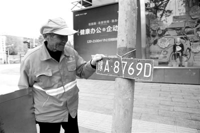 4月11日,在郑州花园路农科路,一副车牌被挂在树上已经4天,环卫工师傅王川和他的老伴儿每天像“摆摊”一样看管着这个车牌,白天挂上晚上收回家。挂车牌的路段车辆川流不息,却无人问津,王师傅说找不到车主,就一直挂下去。