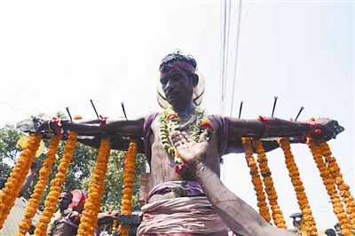 当地时间4月13日,印度加尔各答,当地印度教信徒庆祝贾函节(Shiva Gajan Festival),信徒被铁钉穿身游行。虔诚的信徒通过自虐的方式向湿婆神祈福,贾函节也是标志着孟加拉新年的结束。东方IC 供图