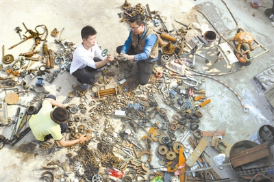 4月15日,在位于河北邢台桥东区的工作室,王书杰(右一)和伙伴们挑选可以利用的废旧金属。