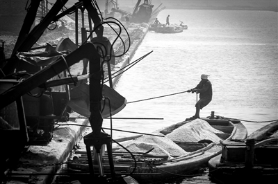 南堡盐场是中国第一个自行设计、自行施工建设的海盐生产场。卸船的机械手运动很快,运盐工要配合好机械手的节奏,不停地调整漕船的位置。