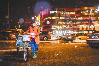 2015年11月22日,北京突降暴雪,当天晚上,北京朝坝环卫中心的工人们在各自的工作岗位,彻夜清扫路面积雪。
