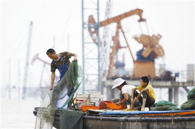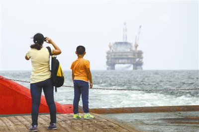 2015年8月7日,家属们参观结束后乘船离开,目送海上作业平台渐渐远去。这一天是中国海洋石油秦皇岛渤中作业公司的“家属开放日”,部分平台员工的家属有幸走上平台,参观海上一线作业的真实场景。