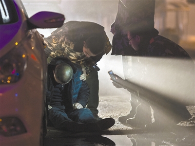 2015年2月15日晚,江苏公安边防总队连云港支队海头边防派出所官兵在雨中巡逻时,发现一名酒后摔伤的男子并立即展开救助。图为官兵用身体为受伤男子遮雨。