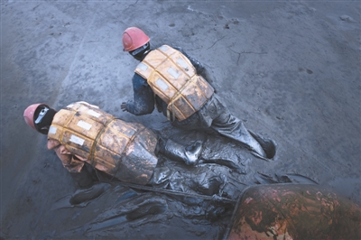 2015年4月8日,在东方物探冀东油田南堡Ⅰ号项目现场,两名物探人在滩涂地带爬行,以保证检波器点位埋置效果。