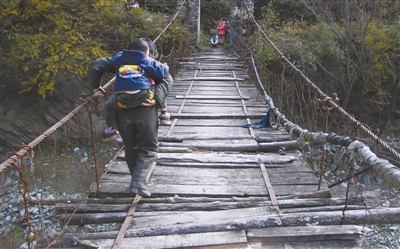 赵素英背小学生过桥。在甘肃陇南大山深处,山村教师赵素英一人坚守这所学校已经35年。