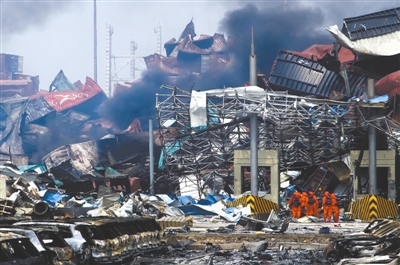 2015年8月14日,天津市滨海新区爆炸发生后的第二天,在爆炸现场大火没有完全熄灭的情况下,部分消防干警深入核心区探查情况。