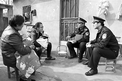 自4月1日起,南京铁路公安处民警深入辖区积极开展为期一个月的春季“四防”安全宣传活动。活动中,民警向群众宣传“防火、防盗、防诈骗、防事故”安全常识。截至目前,民警共走访铁路周边厂矿企业115家,发放安全宣传资料20000余份。图为民警入户走访宣传“四防”安全知识。莫静 摄
