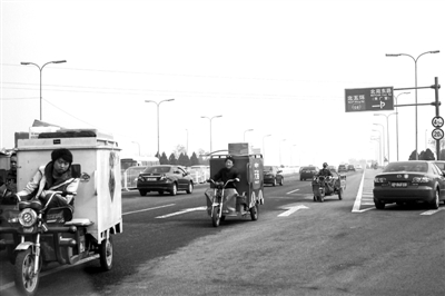 4月13日,北京。一些电动三轮车在全封闭的机动车道路上逆行。该处为G6高速连接北五环的路段,也是通往北苑东路方向的岔路口。