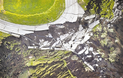 图为4月16日,在日本九州熊本县,地震引发的泥石流将道路毁坏。
