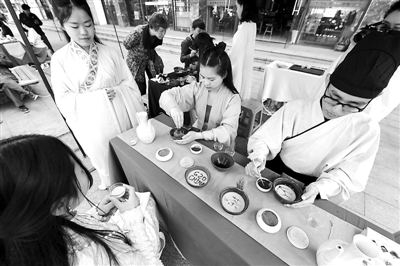 杭州职业技术学院的学生在展示传统点茶技艺。