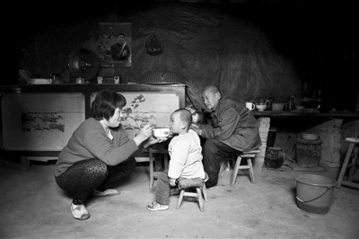 4月4日,山西芮城,一位奶奶蹲在房间里喂小孙子吃午饭。