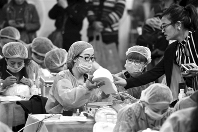 4月18日,在辽宁沈阳举行的2016美妆大赛吸引了100名美容从业者参与,选手在比赛中为面部模型上妆。图为参赛选手在与评委交流。