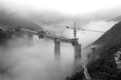 4月18日,渝黔铁路刘家大院双线特大桥主跨合龙现场。峡谷底部涌出的白雾将大桥缠绕,整个大桥好似仙境中的通天桥梁,让人产生无限遐想……