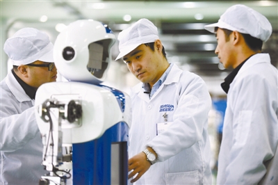 背靠车床,一身工装。凝神专一,技进乎道。任何一个工业时代的故事中,都少不了工匠的身影。中国制造迈向2025,大国呼唤工匠精神。4月12日,董状(中)在沈阳新松机器人公司与同事检查组装中的机器人。新华社记者 潘昱龙 摄