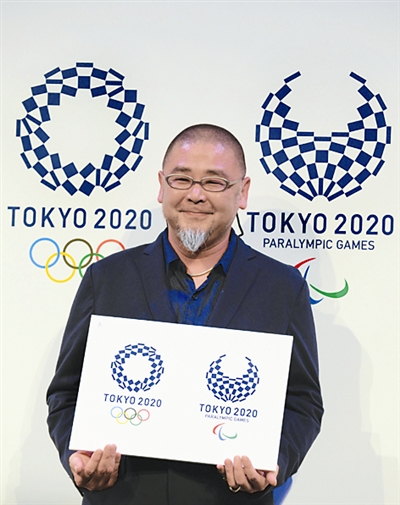 4月25日,在日本首都东京,2020年东京奥运会及残奥会会徽设计者野老朝雄与会徽合影。