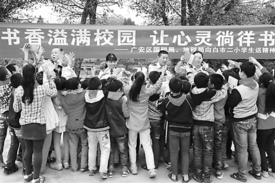 4月21日,在偏僻的四川省广安市广安区白市二校,该校学生正在争抢国地税叔叔阿姨手中的图书。该校是一所偏僻的村小,现在仅有34名学生,全是留守娃。获悉该村小图书紧缺的情况后,四川省广安市广安区国税局、地税局党员志愿者为学生送去量身订制的精神“营养餐”——近千册科普画册、经典美文、文艺书籍、童话故事等课外读物。