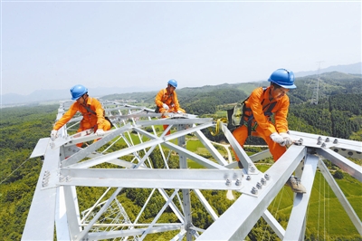 图为在特高压直流输电线路现场,施工人员冒着高温在塔上紧固螺栓。