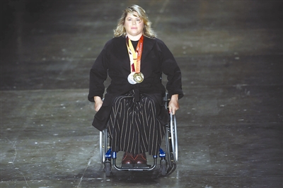 4月29日,巴西轮椅篮球项目运动员伊丽莎白·戈梅斯参加圣保罗时装周“Joao Pimenta”品牌的走秀。 新华社发(拉埃尔摄)