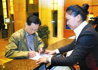 ▲4月30日24时许,陈生(左)在北京民族饭店填写增值税发票客户信息表。