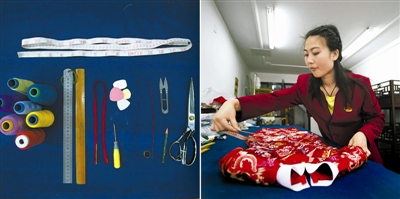 左图:陈文迪制作中式服装所用到的部分工具;右图:陈文迪在瑞蚨祥大栅栏店内制作旗袍(拼版照片,4月29日摄)。