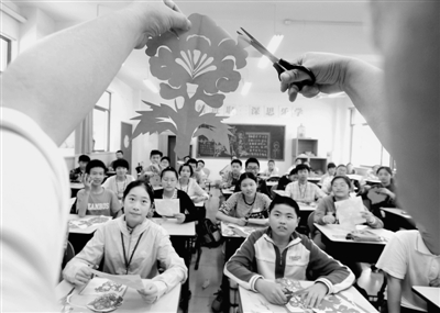 5月6日,一名民间手工艺人向苏州市平江中学的学生传授花朵剪纸技艺。