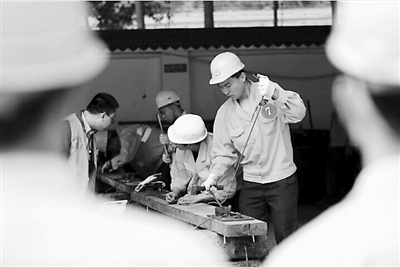 图为4月13日,该段桥隧工选手正在参加桥梁步行板制作比赛。