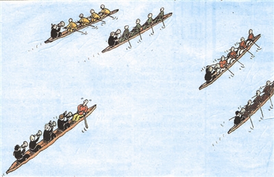 划艇比赛争夺正酣,其中一队明显落后,原来这个团队多在动口,只剩单身摇撸……“光说不练的把式”是难于取胜的。