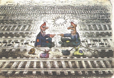 两位旅行者穿越铁路时撞倒在地,面对面地相互指责没个头绪。人们为其喋喋不休的争吵深感不安——别发生真的撞车啊!【乌克兰】艾琳那