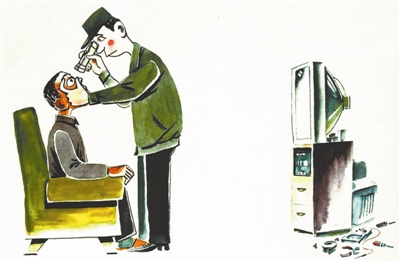 电视机出了故障,看来看去,修来修去,还是看不清楚。于是,修理工陷入思考。这一想,终于发现了问题,原来是电视机主人的眼睛出现了故障。这件作品使用了典型的漫画语言,即逆向思维。