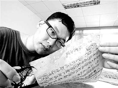 杨洪飞用毛笔尖轻点特制的糨糊,小心翼翼地刷在破损处,并将专门的补纸贴在上面,抚平后,再撕去多余的部分。