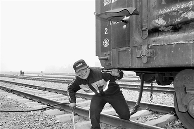 5月5日,锡林浩特市刮起7级大风。为保证货车安全,内蒙古集通铁路公司货车检车员季哲爬进爬出仔细检查货车。彭杰 摄