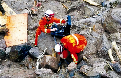 5月8日,在福建泰宁山体滑坡救援现场,武警水电二总队六支队官兵利用“蛇眼生命探测仪”对任务区进行搜救(手机拍摄)。 新华社发(项蒋敏 摄)