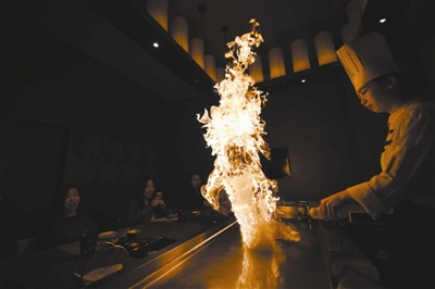 4月8日,太原,李茹芳为顾客烹煎牛排,在浇入少量白兰地后,铁板上会腾起绚丽的火焰,极具观赏性。